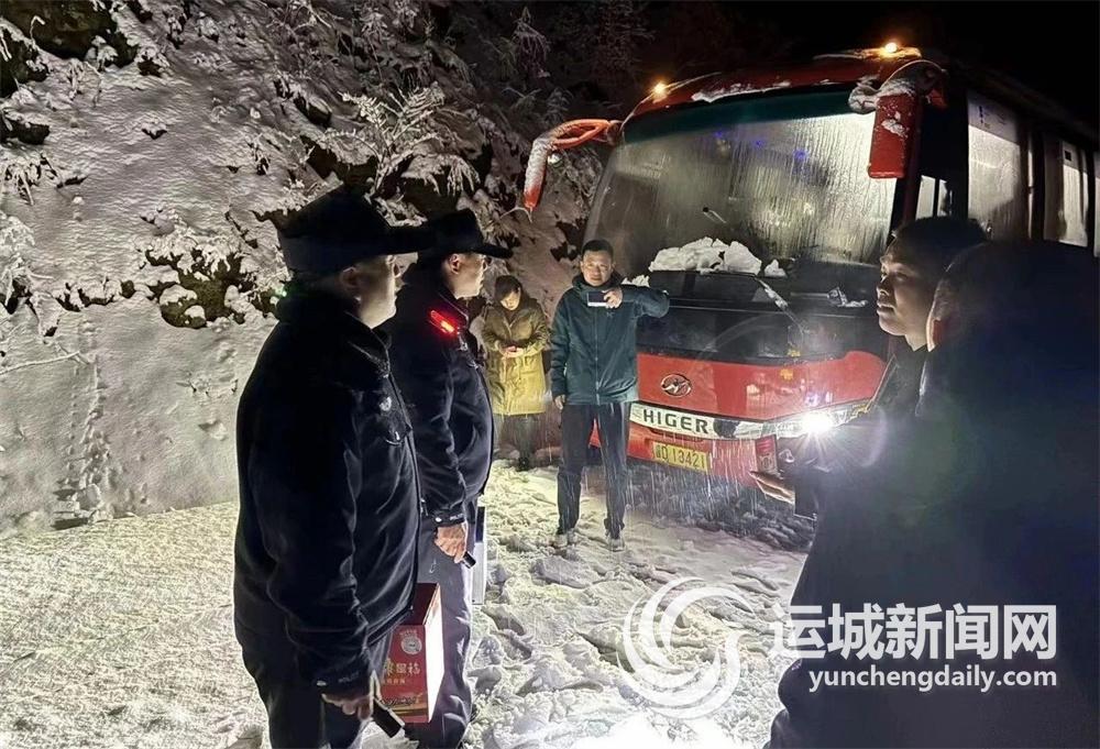 3月24日,受冷空气影响,绛县磨里镇垣址坪村下起了大雪,气温骤降,山区道路也结了冰。“警察同志,我们的客车被困在路上了……”当天22时40分,绛县公安局接到群众报警称,在垣址坪村附近,一辆载有21人的客车被困。“备好物资,立即出发!”接警后,绛县公安局磨里派出所民警迅速与磨里镇政府取得联系,并第一时间准备了方便面、火腿肠、热水等物品,冒着风雪,火速赶至客车被困地点。