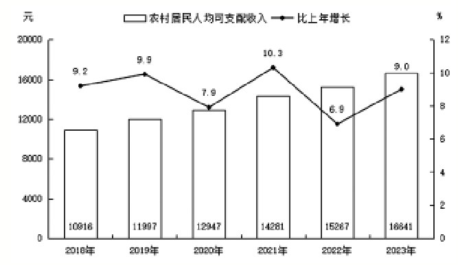 图9 2018—2023年农村居民人均可支配收入及其增长速度