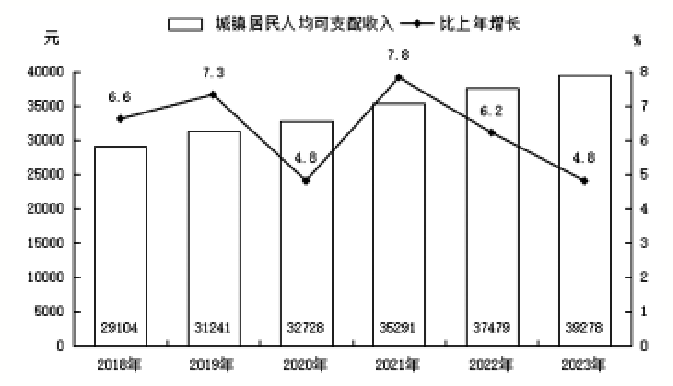图8 2018—2023年城镇居民人均可支配收入及其增长速度
