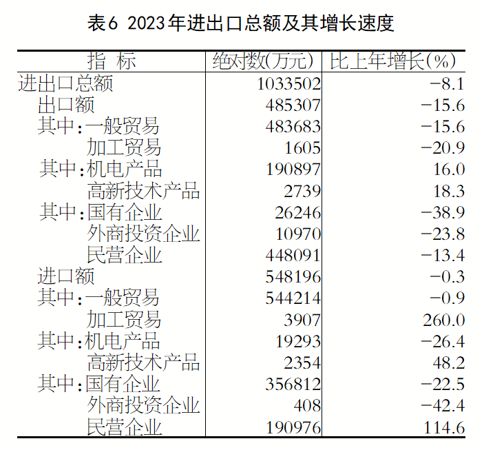 全年全市进出口总额103.4亿元,比上年下降8.1%。其中,进口54.8亿元,下降0.3%;出口48.5亿元,下降15.6%。