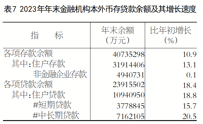 年末全市金融机构本外币各项存款余额4073.5亿元,比年初增长10.9%。年末全市金融机构本外币各项贷款余额2391.6亿元,比年初增长18.4%。