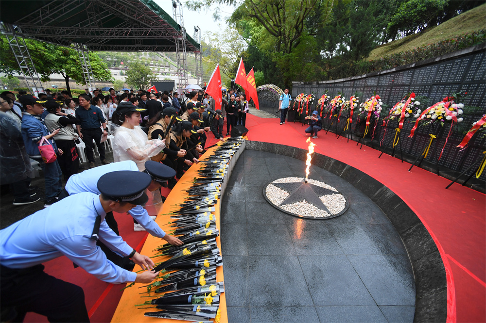 3月31日,人们向福州三山人文纪念园抗日志士纪念墙敬献鲜花。