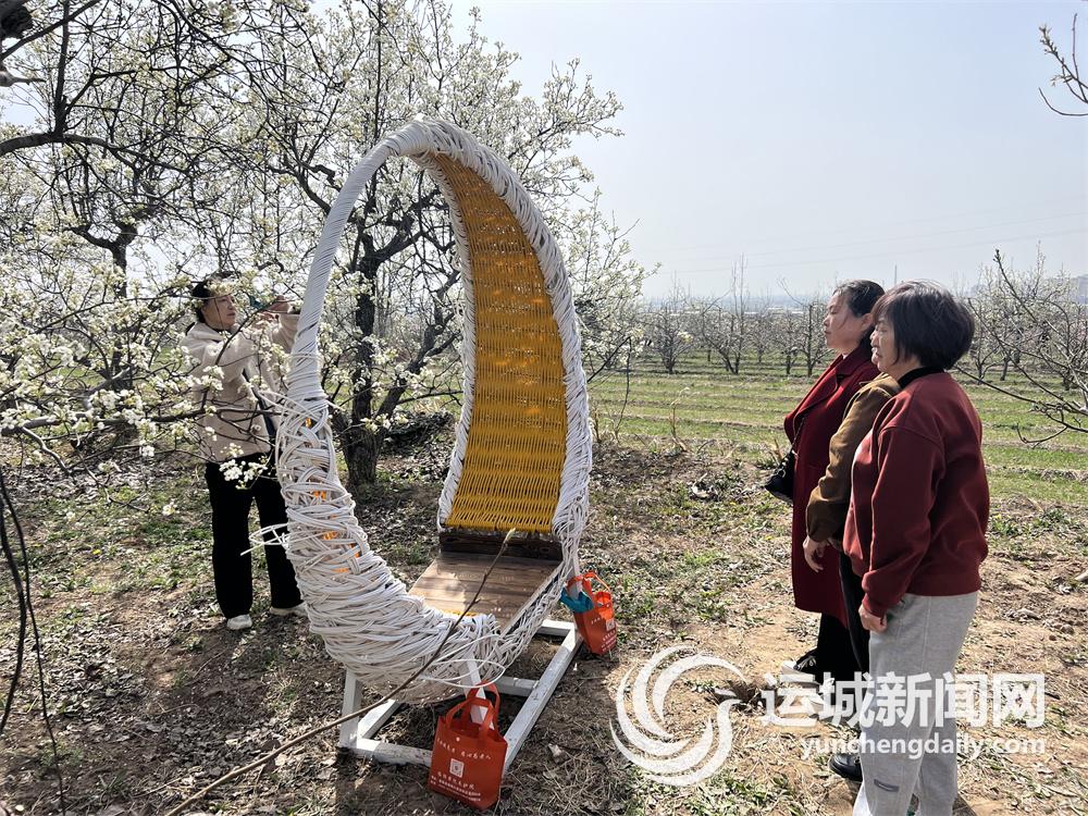 游客在猗氏镇黄斗景梨花节拍照留念。
