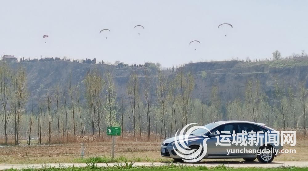 3月31日,平陆县张村镇太阳渡黄河岸畔,数架滑翔伞腾空而起,在天空自由翱翔,吸引了不少踏青的游客和附近村民观看。