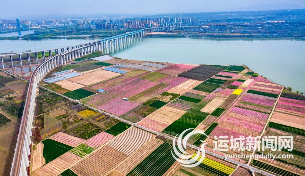3月30日,在平陆县境内拍摄的黄河岸边春日美景。田间盛开的桃花、油菜花与穿越其中的黄河一号旅游公路、浩吉铁路及黄河交相辉映,构成了一幅壮美的春景图。