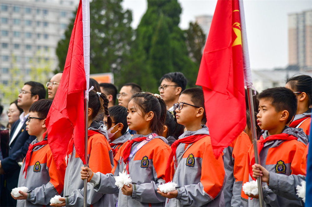 4月2日,少年儿童在济南英雄山革命烈士陵园缅怀先烈。