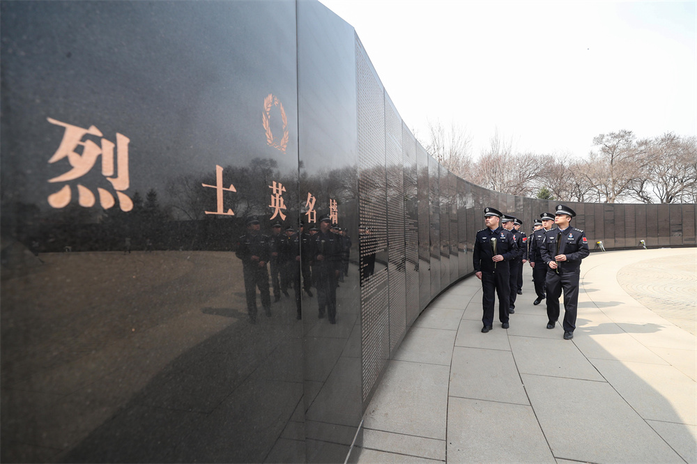 4月2日,在沈阳抗美援朝烈士陵园,沈阳出入境边防检查站民警瞻仰烈士英名墙。