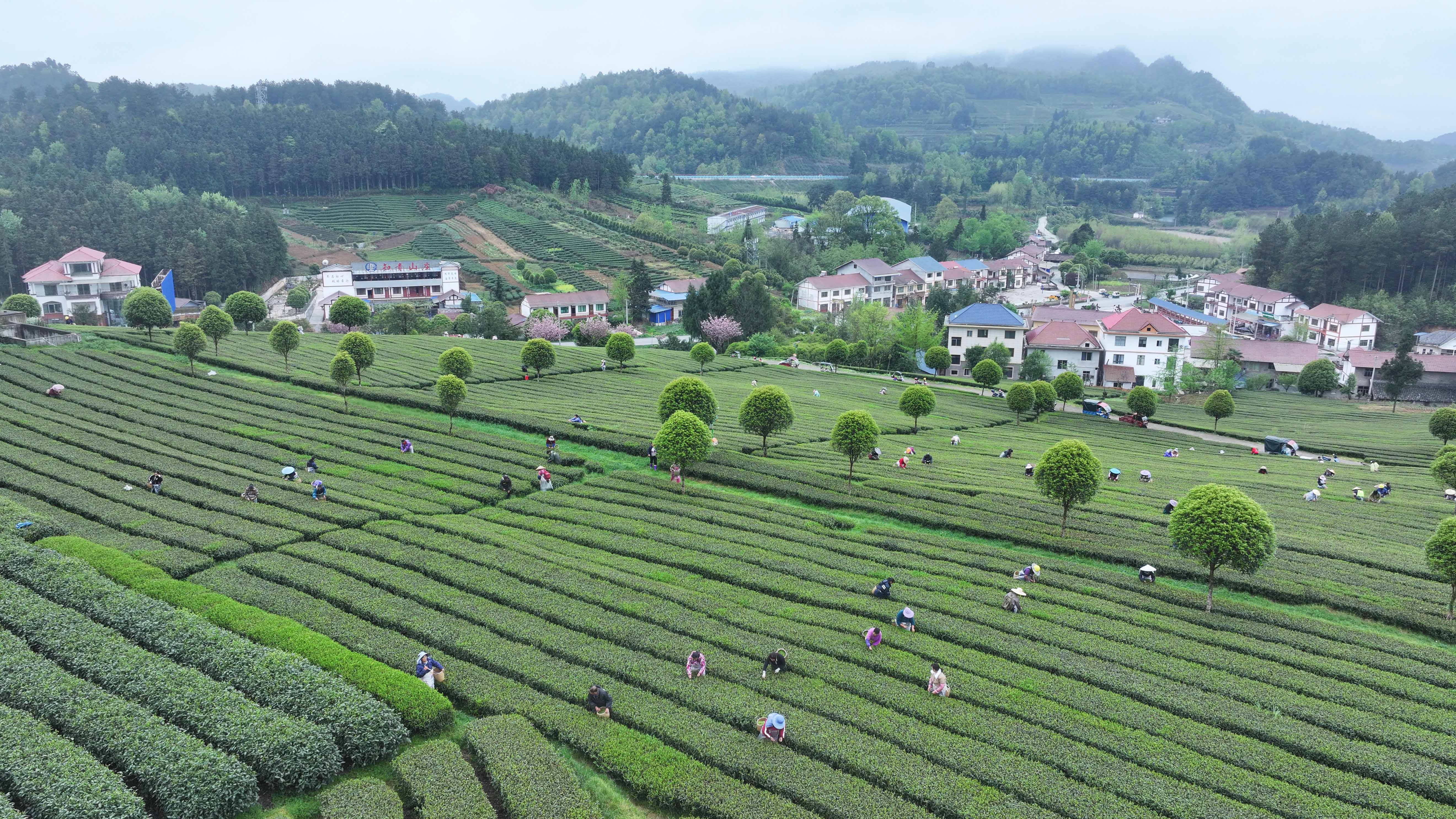 4月5日,村民在贵州省遵义市余庆县松烟镇二龙村茶场采摘春茶(无人机照片)。