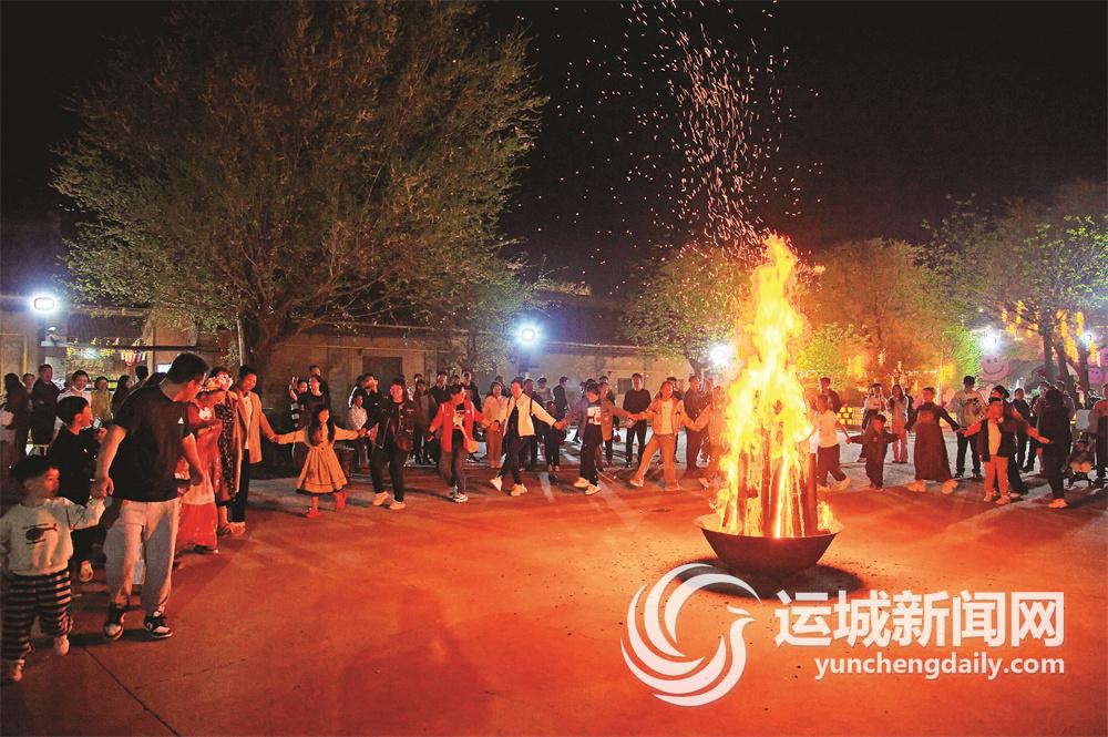 4月6日晚,岚山根·运城印象景区的小广场上燃起了篝火,游客们载歌载舞,热闹非凡。