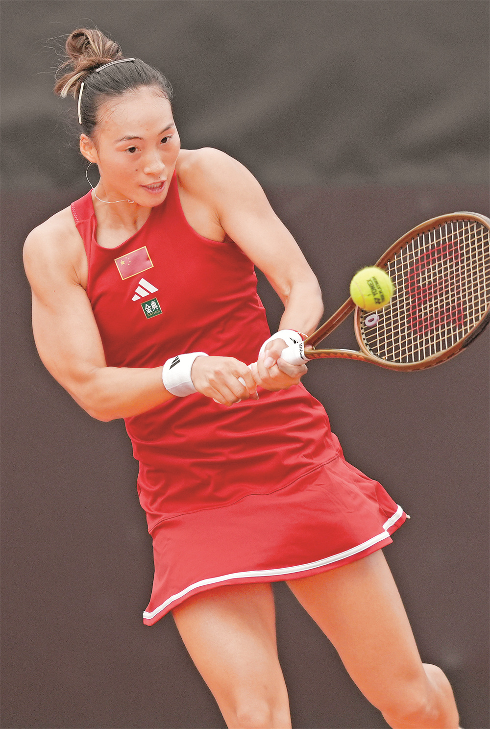 4月9日,中国队选手郑钦文在单打比赛中回球。她2比0战胜中国台北队选手杨亚依。