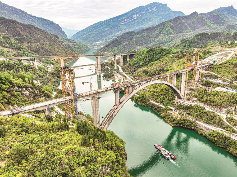 4月8日晚,由渝黔铁路有限责任公司代建、中铁大桥局承建的渝湘高铁黄草乌江双线大桥重庆岸引桥上部结构顺利实现合龙,目前该桥完成建设进度90%,进入全桥合龙前的最后冲刺阶段。 黄草乌江双线大桥是渝湘高铁重庆至黔江段重难点工程,位于重庆市武隆区江口镇境内,全长593.65米,横跨乌江及G319国道。 渝湘高铁重庆至黔江段是我国“八纵八横”高速铁路网中厦渝通道的重要组成部分,是重庆高铁网中东南向高铁通道。 新华社记者 唐奕 摄