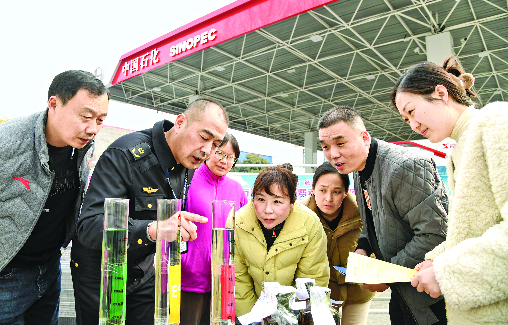 3月13日,在河南省济源市一加油站,质监人员讲解如何鉴别油品质量。 新华社发(苗秋闹 摄)