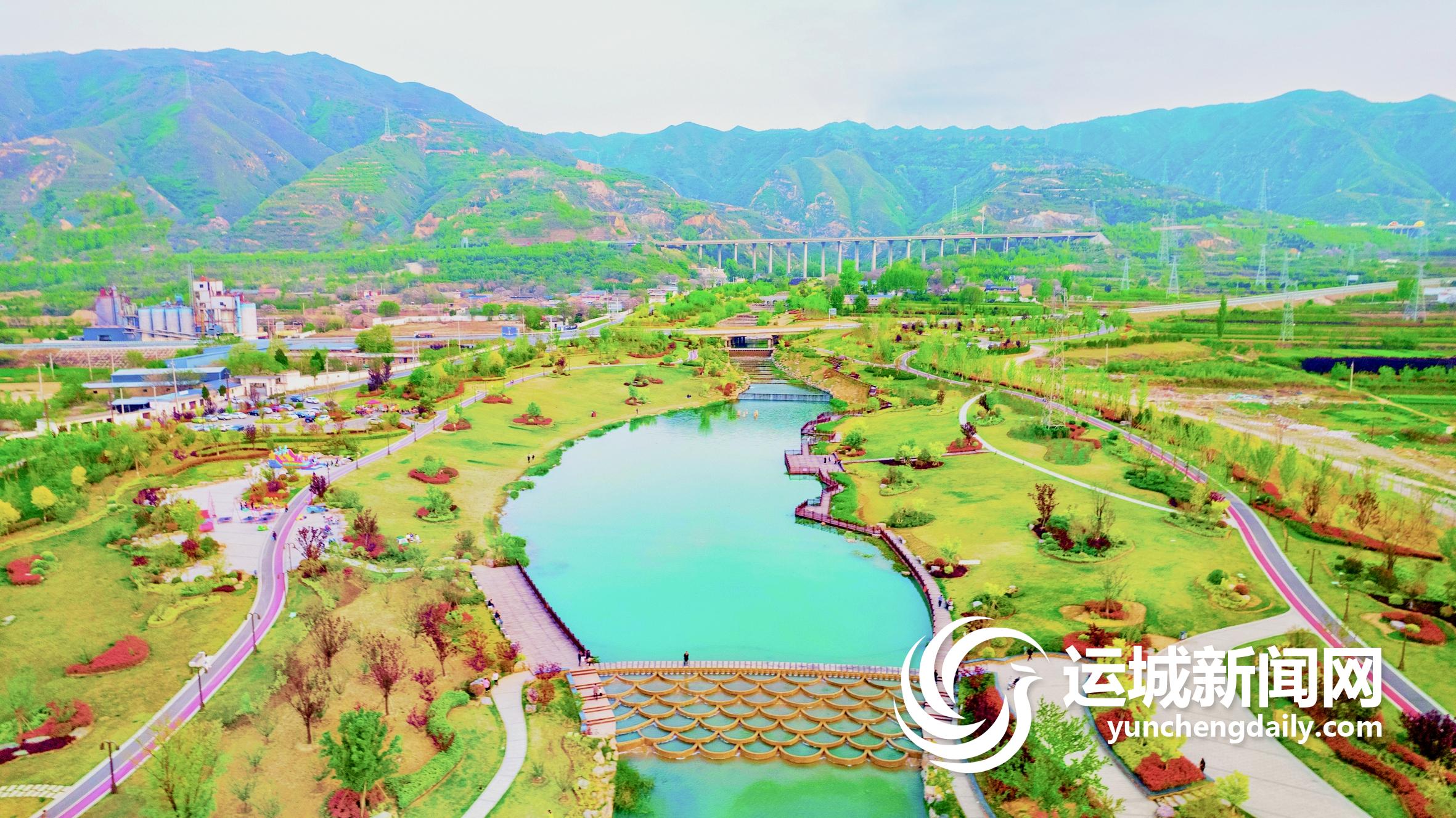 ▲盐湖区解州镇五龙峪河道公园水清岸绿,景色如画(4月10日摄)。