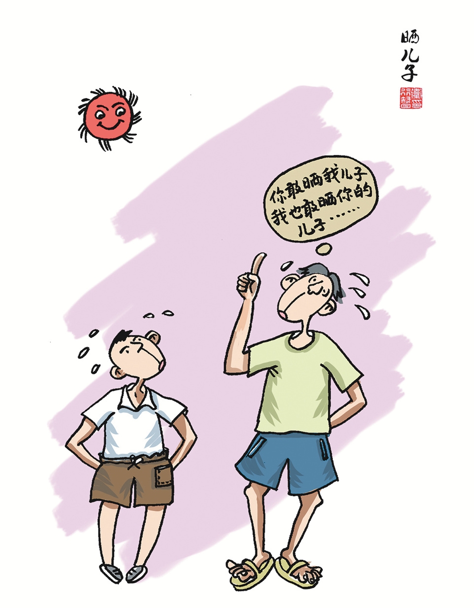 快到晌午吃饭时间了,呆娃从外面回来了。进门一见这场面,就知道是他爸的主意。看着儿子小呆被晒得满脸汗,呆娃不高兴了。二话没说,呆娃就“噔噔噔”地跑到院子里也站到了太阳底下“陪晒”,嘴里还不住地嘟囔着:“你敢晒我的儿子,我也敢晒你的儿子。不信你出来看看我这阵势!”