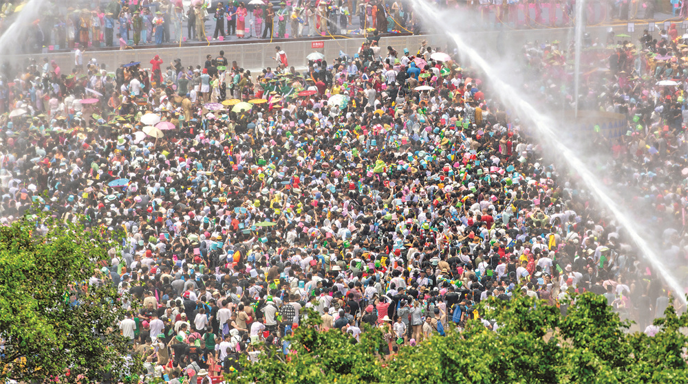 当日,云南省德宏傣族景颇族自治州2024年泼水狂欢节在芒市开幕,上万名当地各族群众与远道而来的游客欢聚芒市广场,互相泼水祝福。 在德宏州,泼水节是傣族、德昂族最隆重的传统节日之一,人们借此祈求吉祥、幸福。今年芒市的泼水节将持续到13日。新华社记者 江文耀 摄
