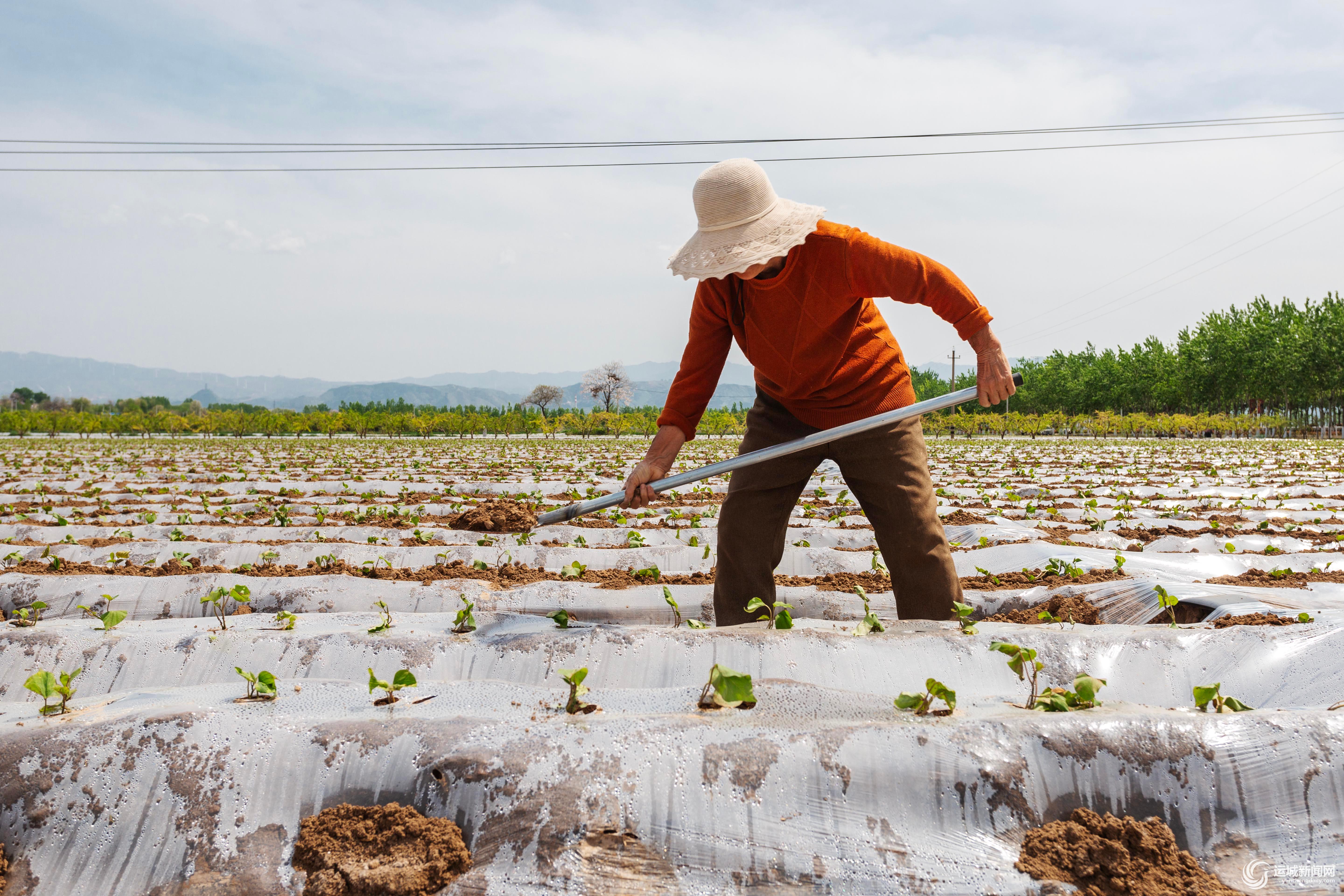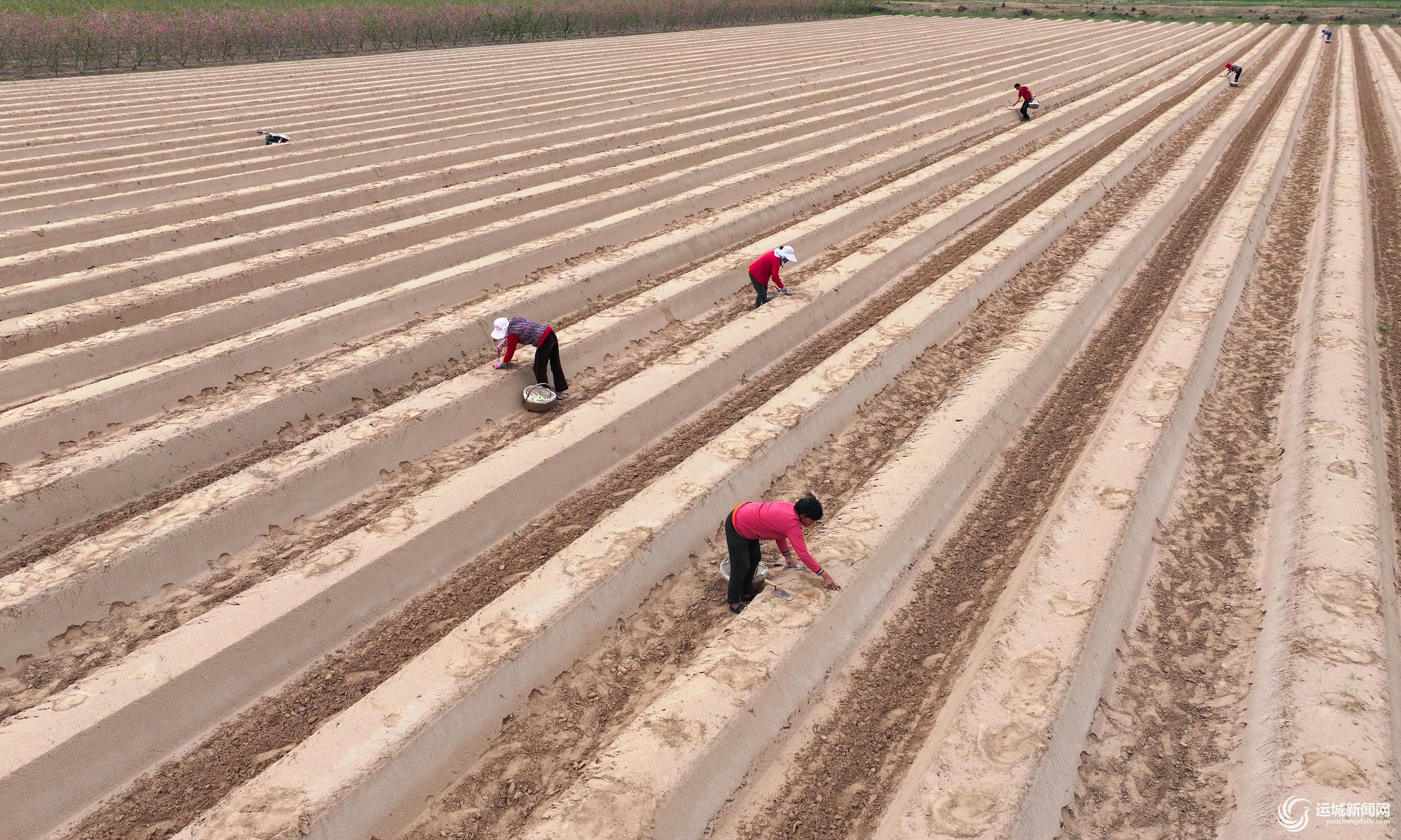 4月11日,农民在夏县裴介镇墙下村的农田里对红薯秧苗实施围土作业。特约摄影 姜 桦 摄