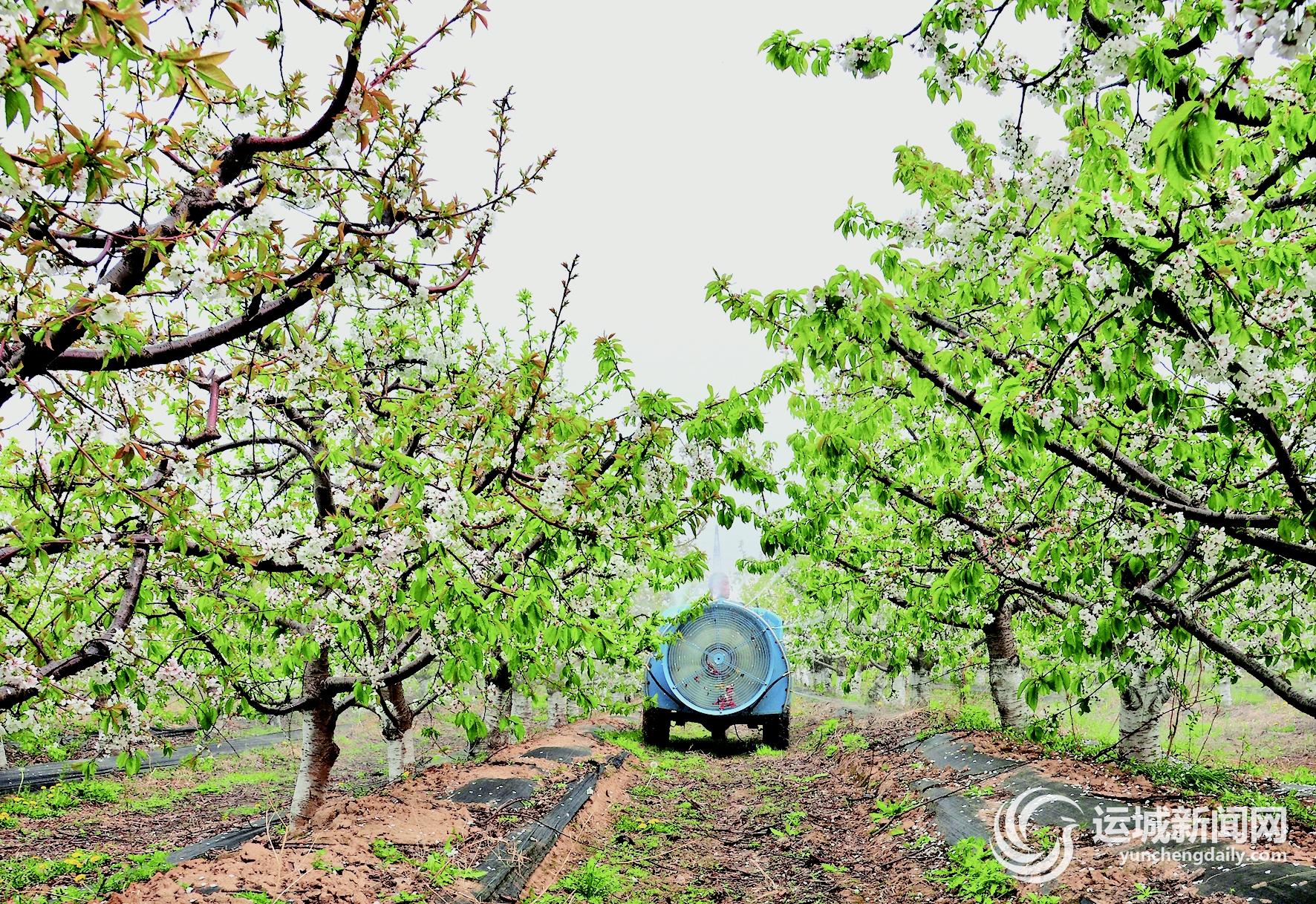 4月11日,果农在万荣县解店镇樱桃园里驾驶小型喷雾车为樱桃树喷雾施肥。特约摄影 张怀心 摄
