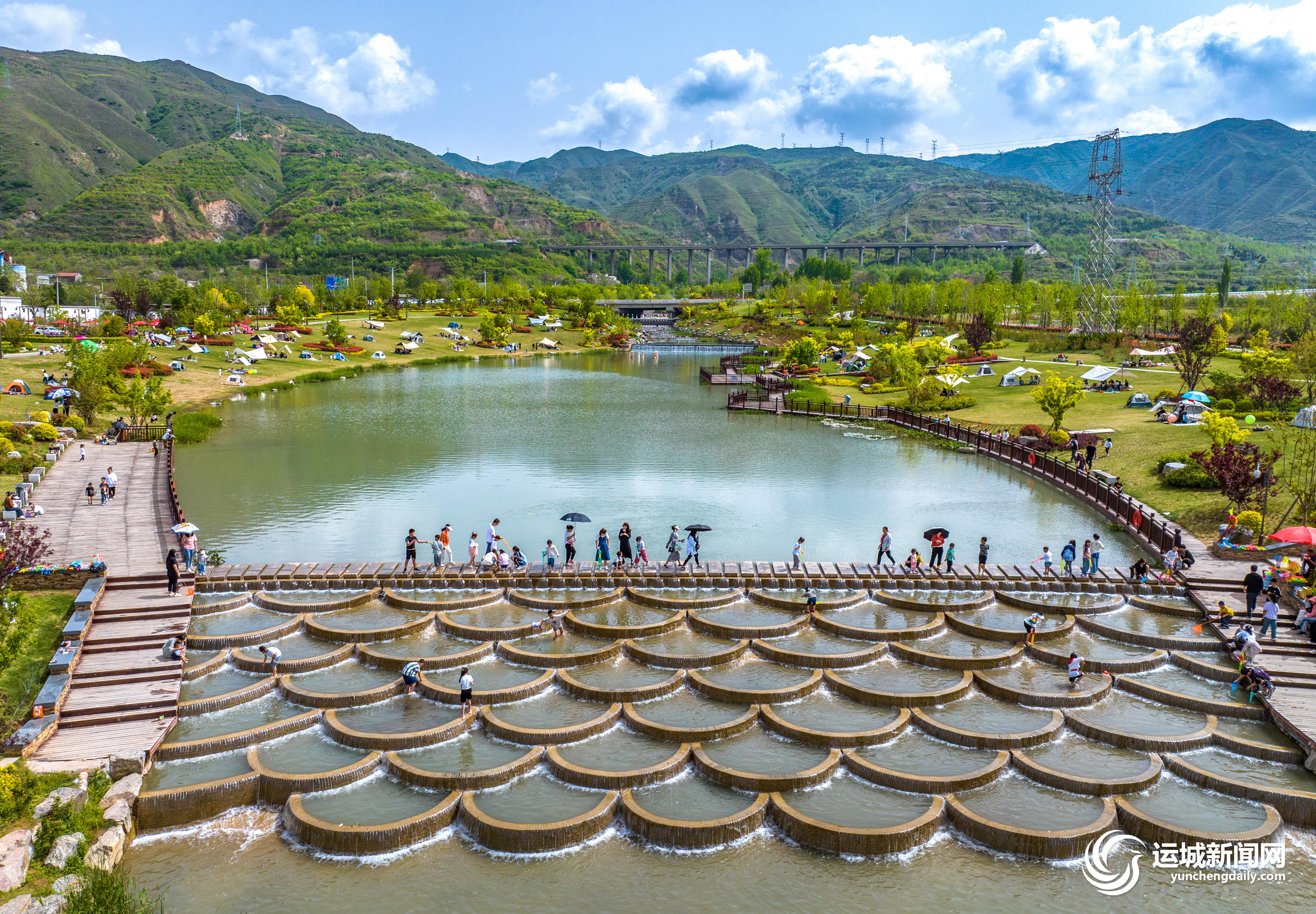 4月14日,盐湖区解州镇五龙峪河道公园水清岸绿,景色如画,吸引众多游人前来游玩。