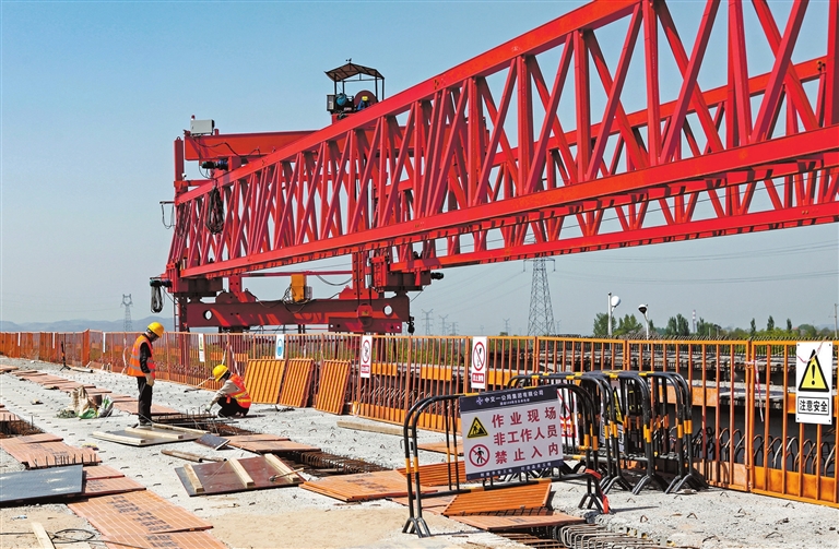 4月12日,在侯马市上马街道程村跨线桥施工现场,工人们正进行T梁架设作业。位于程村附近的国道108改线项目跨线桥共需架设40米T梁30片,目前已架设T梁17片,完成进度的56.6%,桥梁架设工作有序推进。李现俊 摄