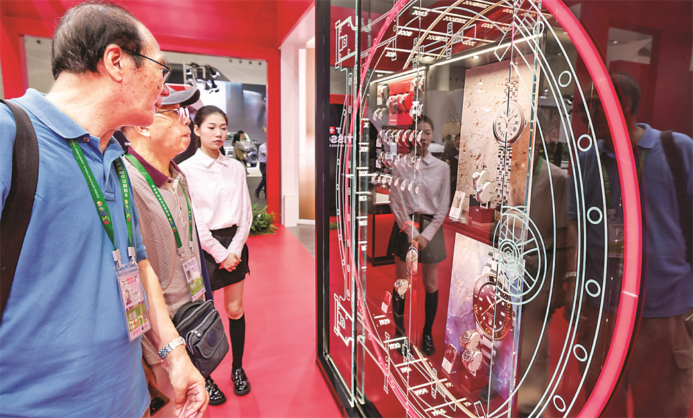 4月15日,观众在第四届消博会上参观展出的天梭手表。