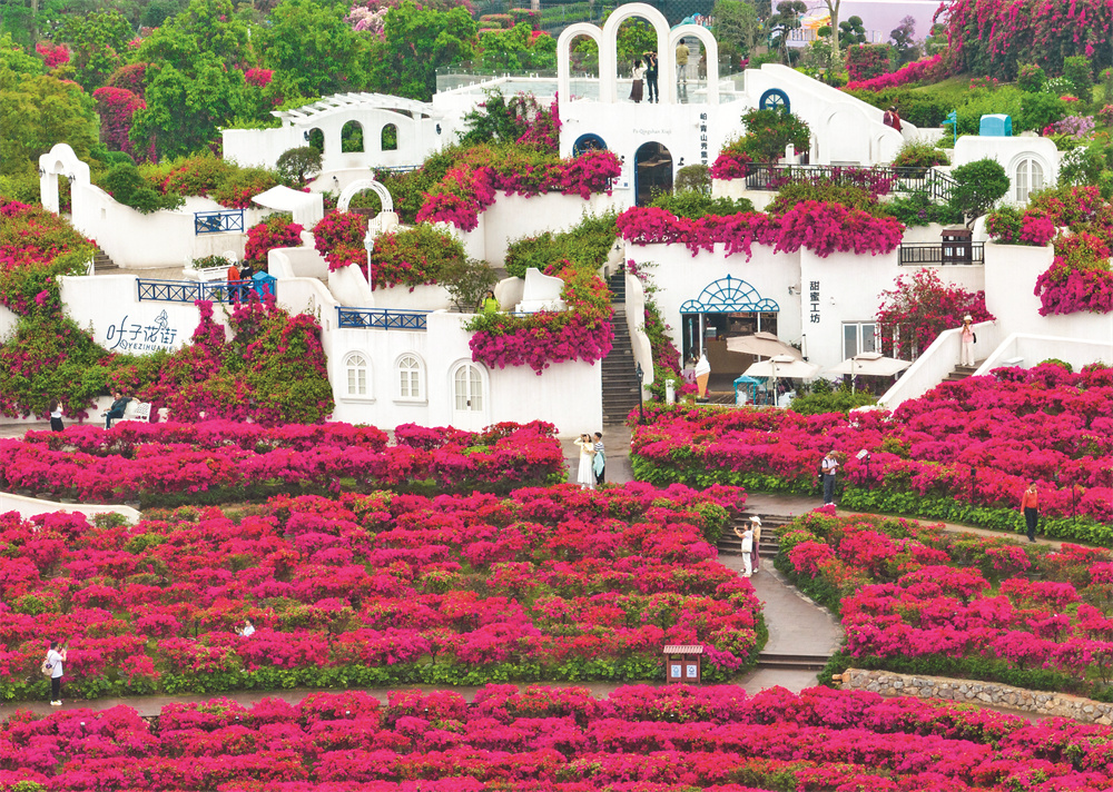 4月10日,游客在广西南宁青秀山景区内的叶子花园观光游览(无人机照片)。