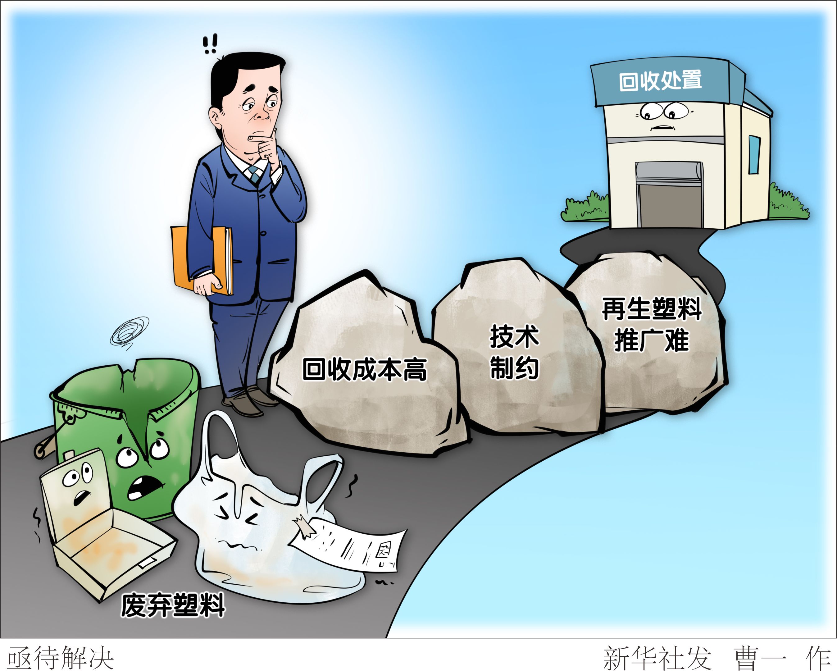 废弃塑料,是日常生活中常见的垃圾。今年政府工作报告提出,强化塑料污染治理。数据显示,我国废弃塑料回收处置只占少部分,一大半只是简单掩埋或焚烧,对生态环境造成挑战。记者调查发现,提高废弃塑料再利用率,亟待解决回收成本高、技术制约、再生塑料推广难等一系列现实问题。 新华社发 曹一 作