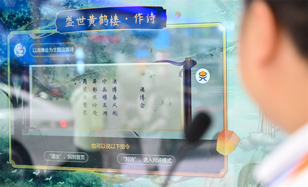 ▲4月15日,观众在消博会上观看AI作诗。 新华社记者 郭 程 摄