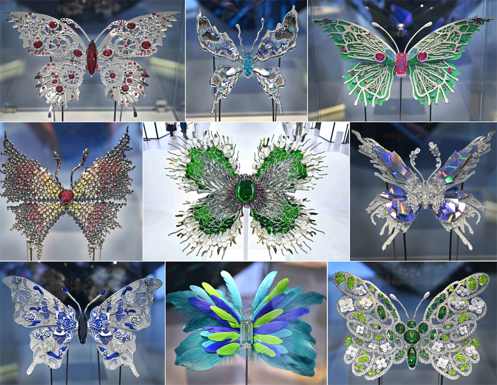 ▲拼版照片:这是消博会上一家珠宝企业展示的用AI设计的珠宝摆件(4月16日摄)。 新华社记者 郭程 摄