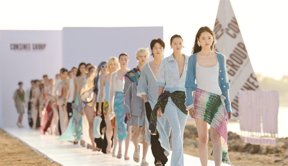 4月15日,在位于海口的消博会海边秀场,模特在展示时装作品。