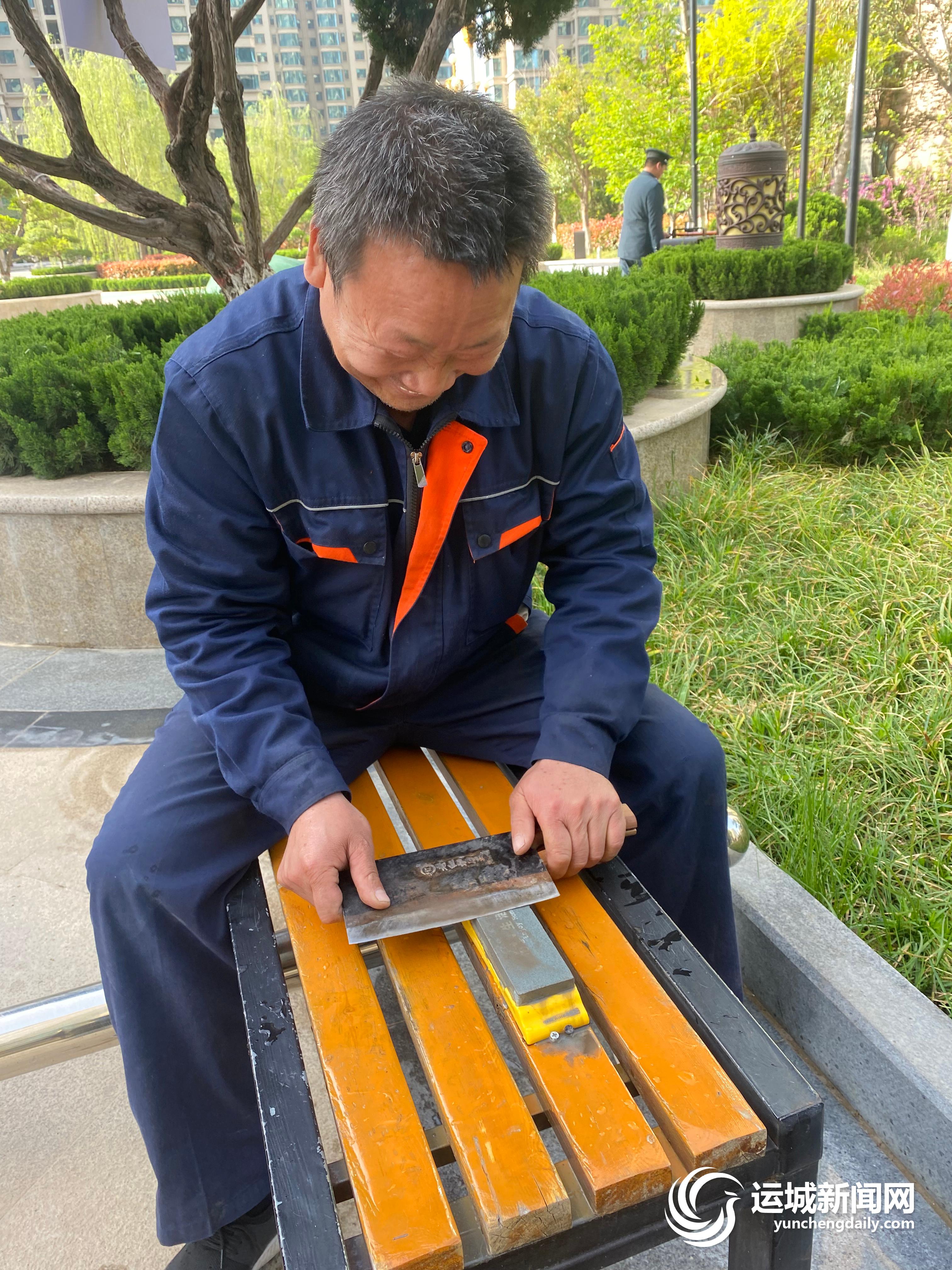 两名维修人员骑坐在长椅上,将一把把菜刀在磨刀石上磨得锋利无比。
