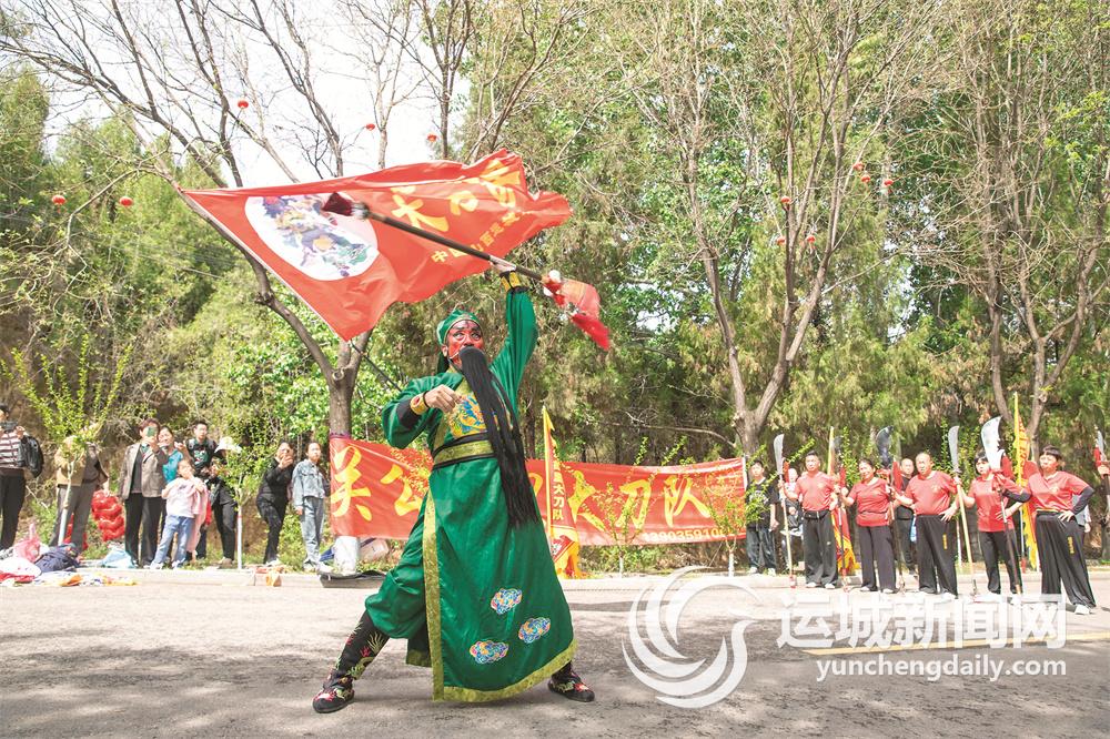 4月14日,夏县堆云洞景区的樱花谷大道上,时不时会响起掌声和喝彩声,在歌曲《这一拜》伴奏下,《关公门前耍大刀》《狮子舞》《舞龙》等精彩的文艺节目精彩上演。
