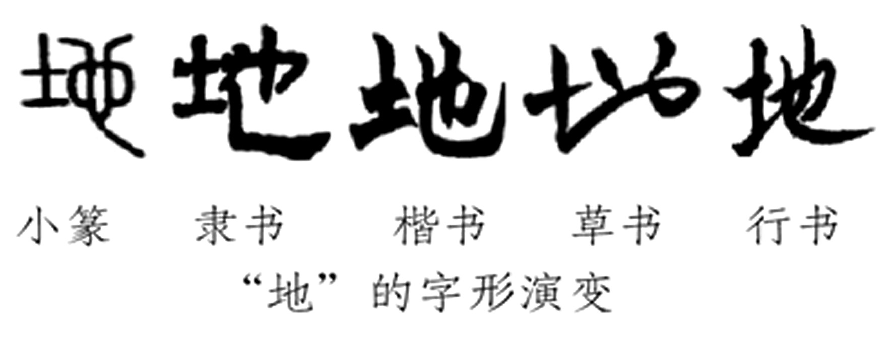 到了小篆中,字形出现了简化和讹变:虽然保留了“土”,但除去了“阜”,并且“它”讹变成了“也”。于是,“地”成了由“土”和“也”两个部分组成,并成为最为主要的一种写法。在后来的隶书、楷书、草书和行书中,一般也是由“土”和“也”组合而成,没有出现本质的变化。