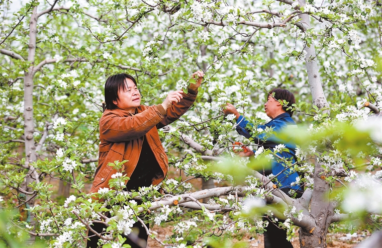 4月10日,襄汾县西贾乡三盛村,果农对苹果园开展疏花作业。眼下,该村千亩苹果园进入盛花期,果农抢抓农时,开展疏花、除草等系列田间管护,白色花海中一派忙碌的景象。