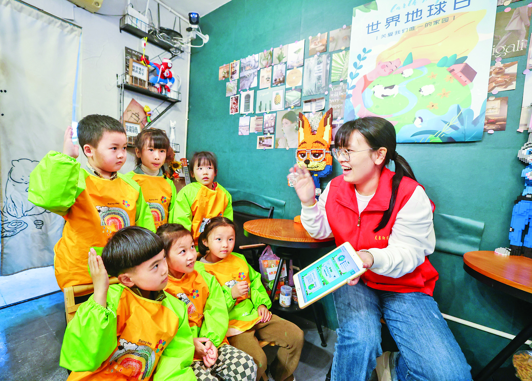 4月17日,在浙江省湖州市吴兴区龙泉街道西白鱼潭社区,志愿者给幼儿园小朋友普及世界地球日的知识。