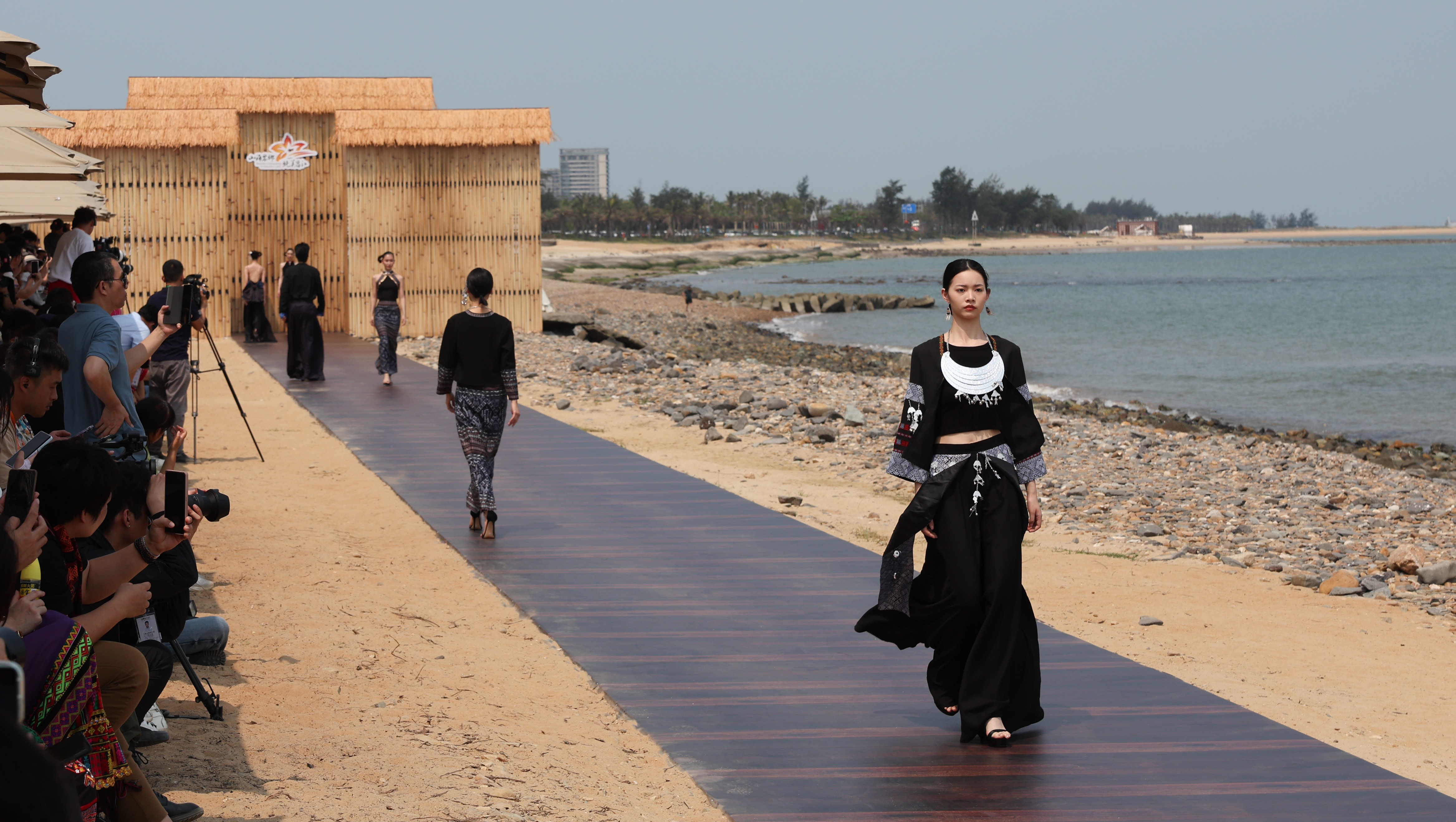 4月18日,在位于海口的消博会海边秀场,模特展示时装。