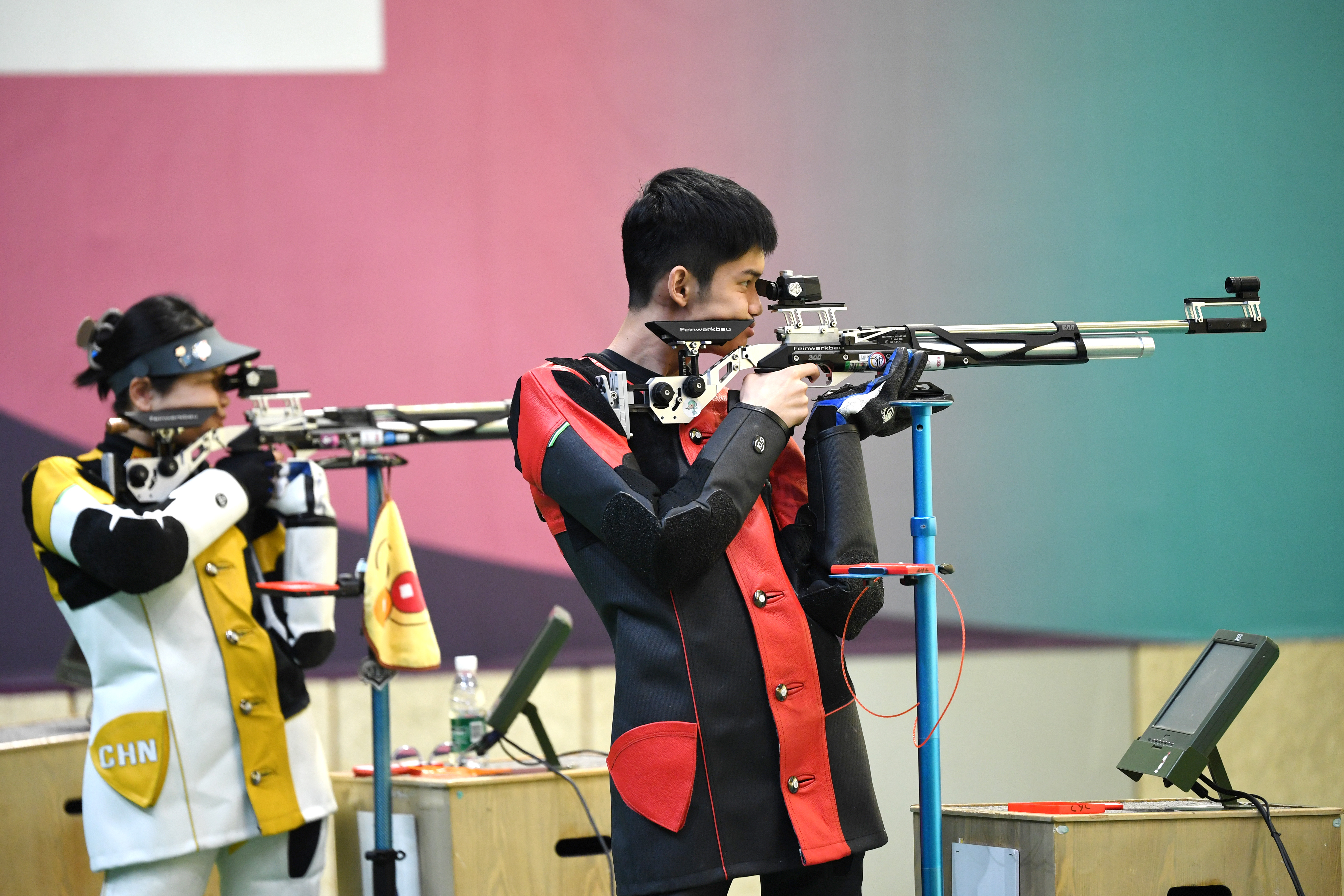 4月18日,盛李豪(右)在10米气步枪个人训练赛决赛中。当日,国家步手枪射击队在北京举行联合训练。
