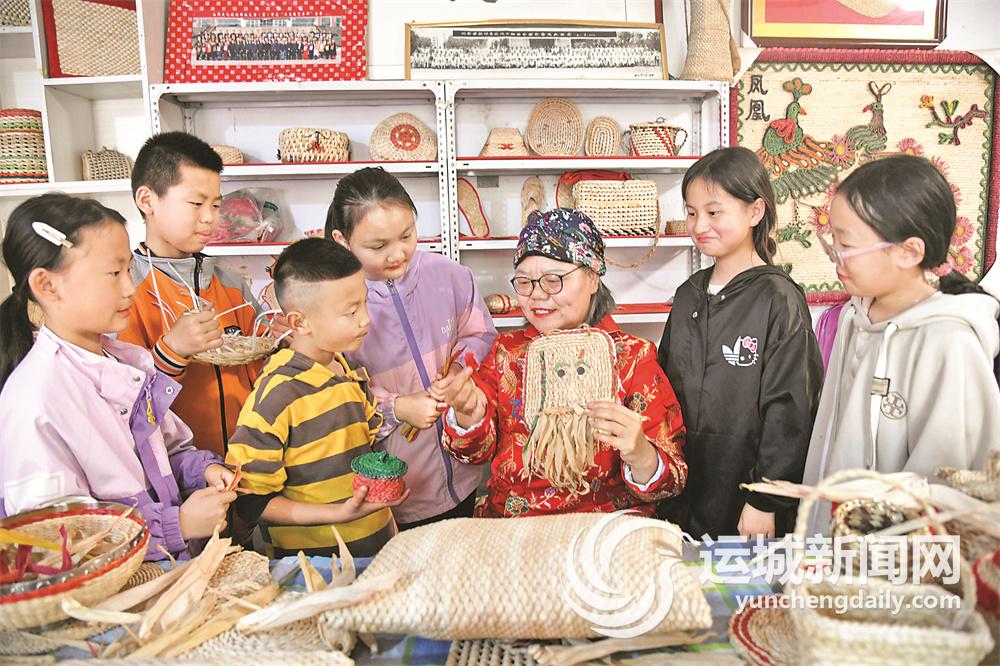4月16日,在省级非物质文化遗产传承人叶菊英(右三)的指导下,闻喜县郭家庄镇西宋村的学生在学习非遗草编制作技艺。近年来,郭家庄镇持续推进文明实践进校园活动,建立省级非物质文化遗产草编传承实验基地,让孩子们更好地感受中华优秀传统文化的魅力。