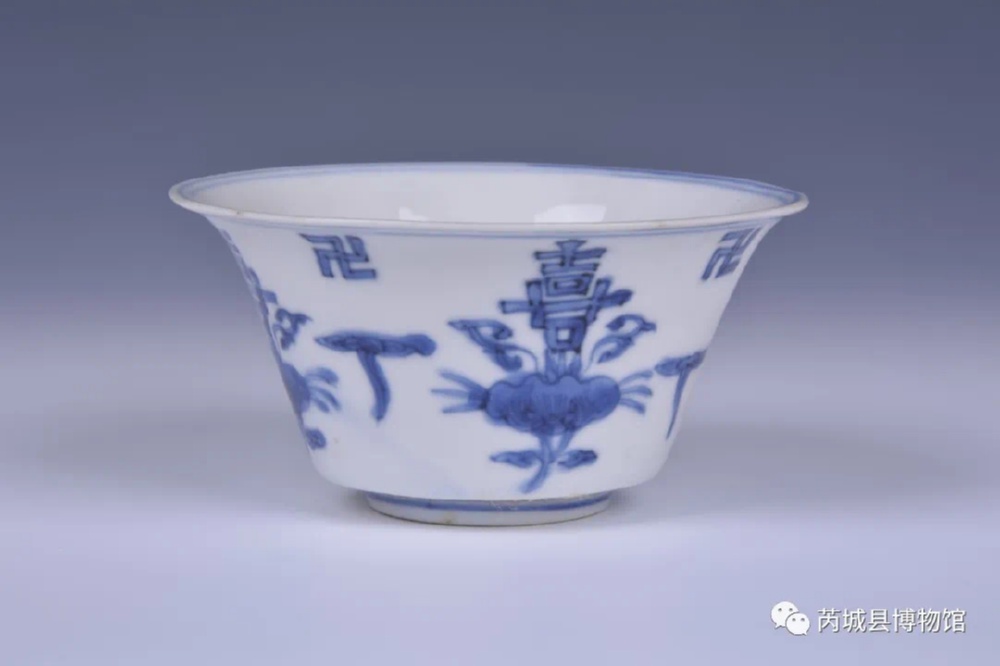 圆口,圈足,器形规整,庄重圆润;青花淡描,内底部绘花卉、喜字纹,外壁绘喜字、万字、花卉纹,外底部饰“大明成化年制”双圈款。胎薄体轻,胎体细腻洁白,画面清澹雅逸,釉质莹润如脂似玉,精雅绝伦。