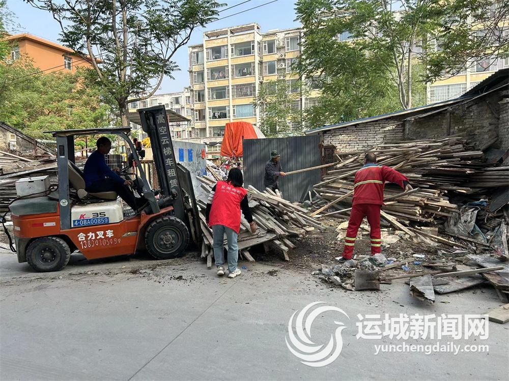 帮工程废料“挪窝”。近日,在盐湖区北城街道石化社区的协调下,该社区辖区供销社巷道堆放的两吨多工程废弃木料被转运别处,巷道又恢复往日的宽敞与整洁。
