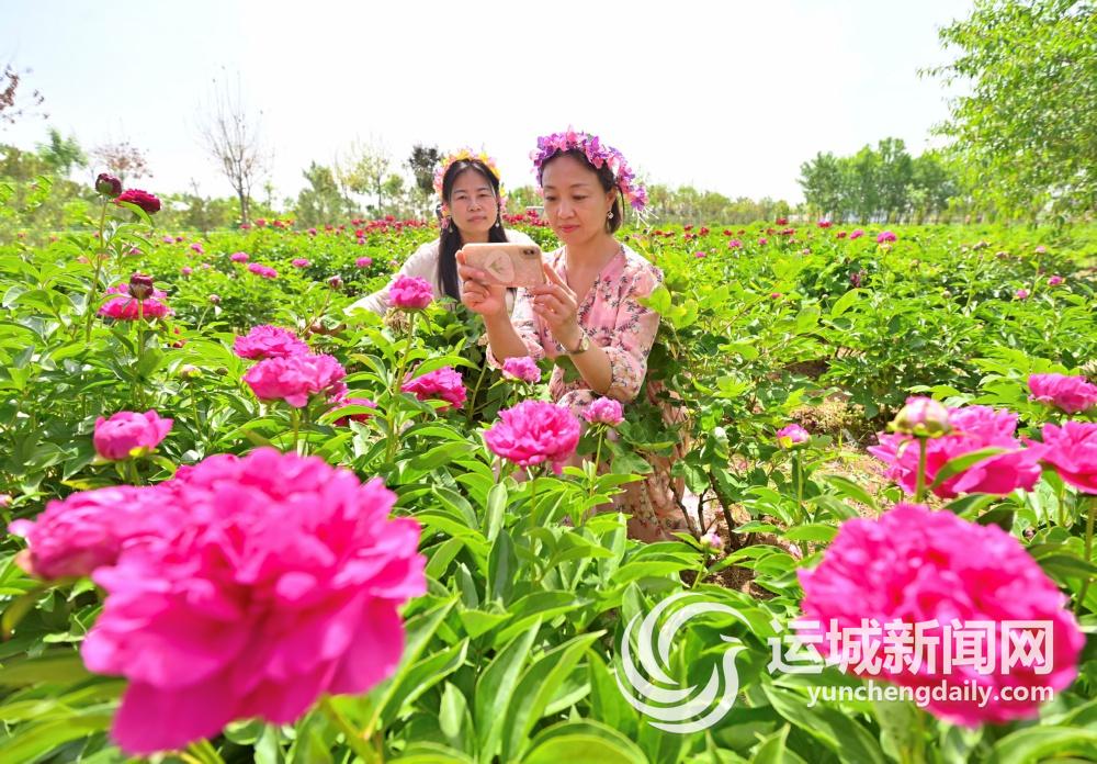 4月24日,游客在盐湖区北相镇河东牡丹园赏花拍照。