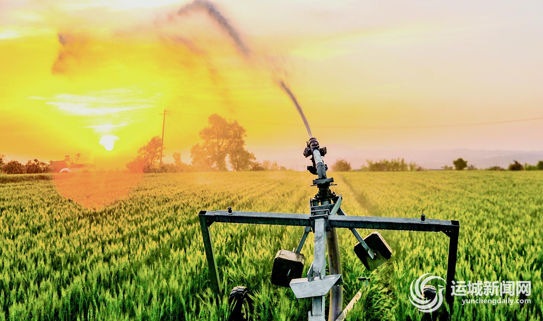 4月25日,在夏县胡张乡王学家庭农场,一台卷盘自走式喷灌设备在为冬小麦进行喷灌浇水。