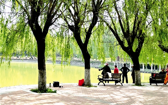 4月21日,天气晴朗,虢国公园杨柳依依、湖水清澈,游园市民呼吸着充满花香的空气,享受烂漫春光。 记者 李秀芝 摄