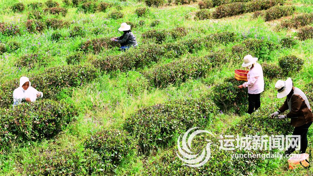 4月28日,在垣曲县一处家庭农场茶园里,村民在采摘茶叶。多年来,该茶园致力于“南茶北引”,建立龙井茶基地,从种植、采收到炒制、销售形成产业链,带动当地村民就近打工增收。