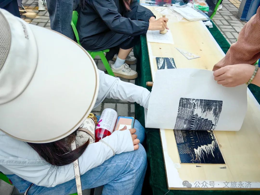 版画拓印作为一种独特的文化活动也吸引了不少游客驻足观看并排起了长队参与体验。在版画拓印区,游客们可以亲自参与拓印过程,感受版画的艺术魅力。在老师的指导下,游客们认真涂墨、匀墨、刷墨、铺纸、印制,一幅幅精美的版画作品便逐渐呈现在眼前。这些作品不仅具有浓郁的地方特色,还蕴含着丰富的文化内涵,让游客们在欣赏的同时,也深刻感受到了传统文化的博大精深。