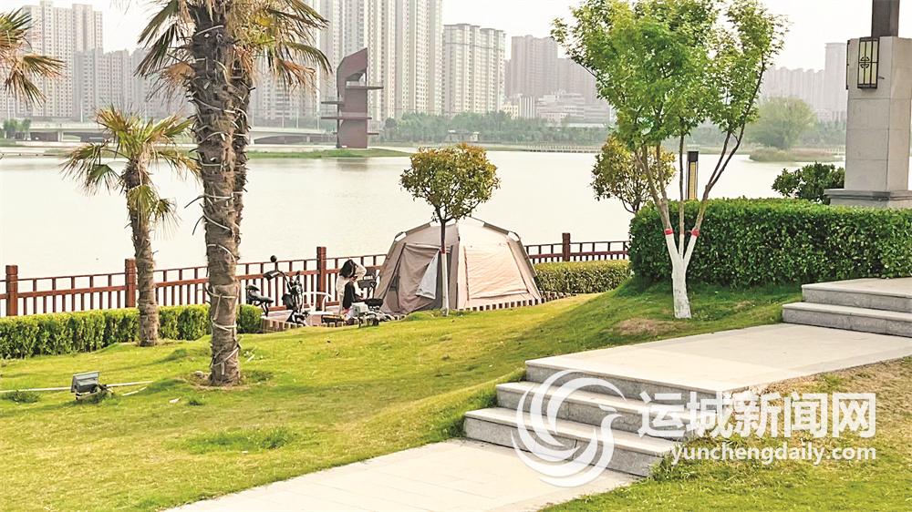 5月4日,市区尧梦湖公园一隅,盐湖区安邑街道橄榄城社区居民段闺针,与好友在此露营。