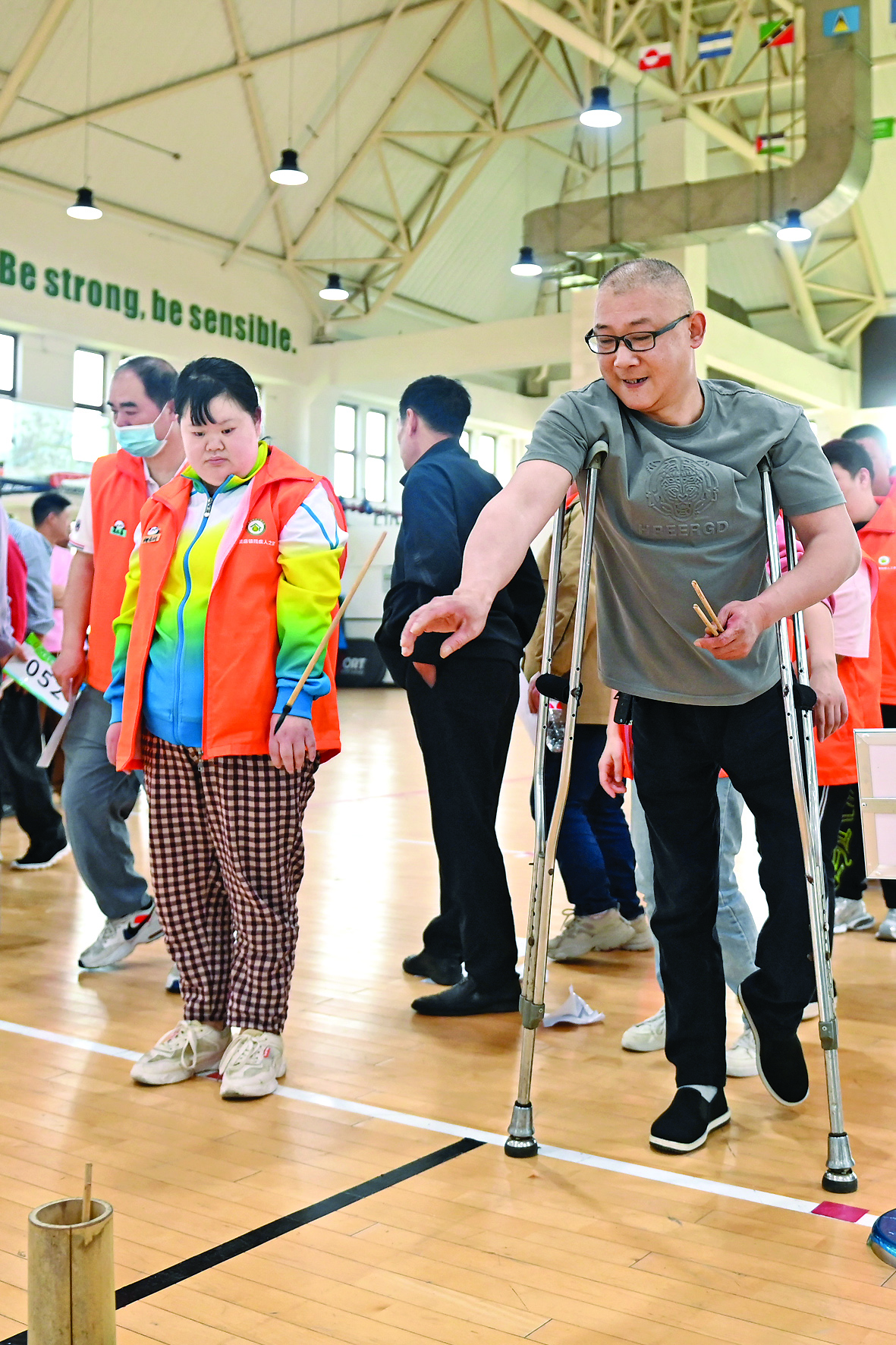 ▲5月8日,一位选手在投壶项目比赛中。当日,浙江省湖州市吴兴区八里店镇在枫叶国际学校举办残疾人趣味运动会,共设置旱地冰壶、套圈、投壶、保龄球、扔沙包5个项目,95位残疾人选手参与比赛。 新华社记者 黄宗治 摄