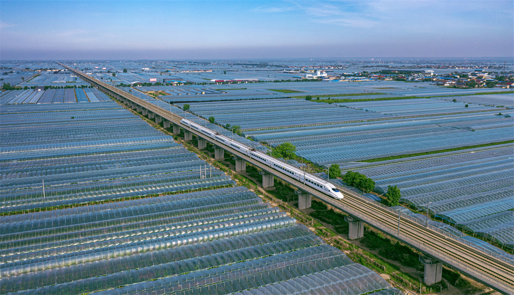 春夏之交,天朗气清。在临猗县庙上乡万亩设施冬枣种植基地,高速列车穿行驶过,与整齐排列的设施枣棚、白墙红瓦的村庄构成一幅美丽的乡村画卷。