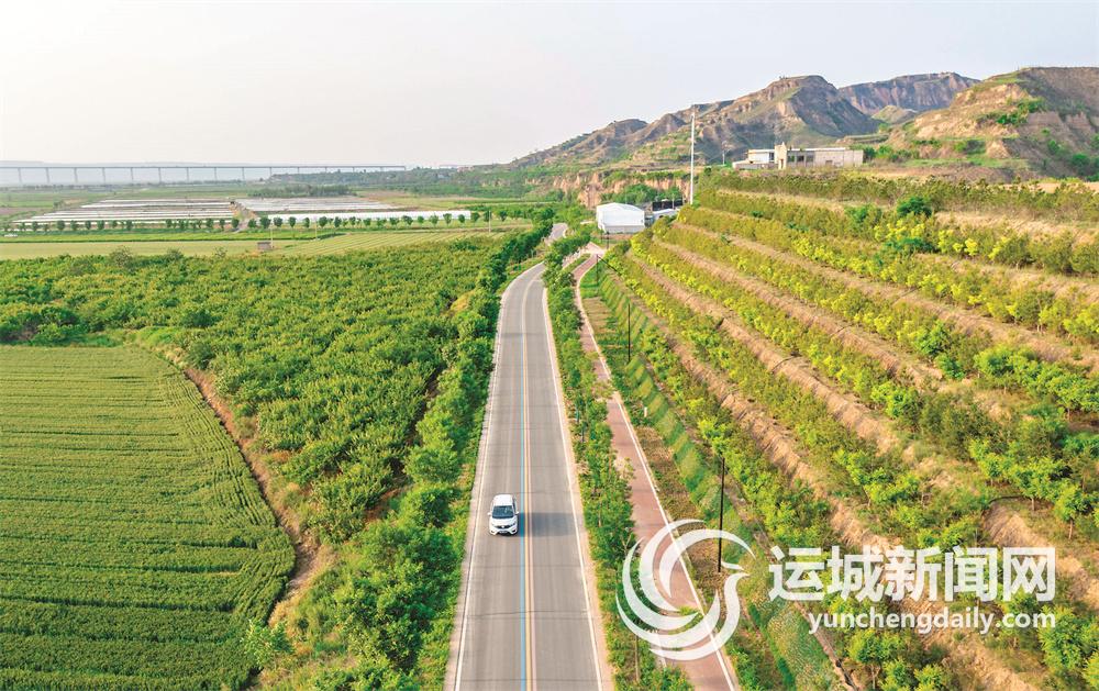 行至黄河一号旅游公路临猗段,只见道路两侧郁郁葱葱,一边是层层绿色的坡面,另一边绿树与农田相接,微风拂过,漾起层层碧波。