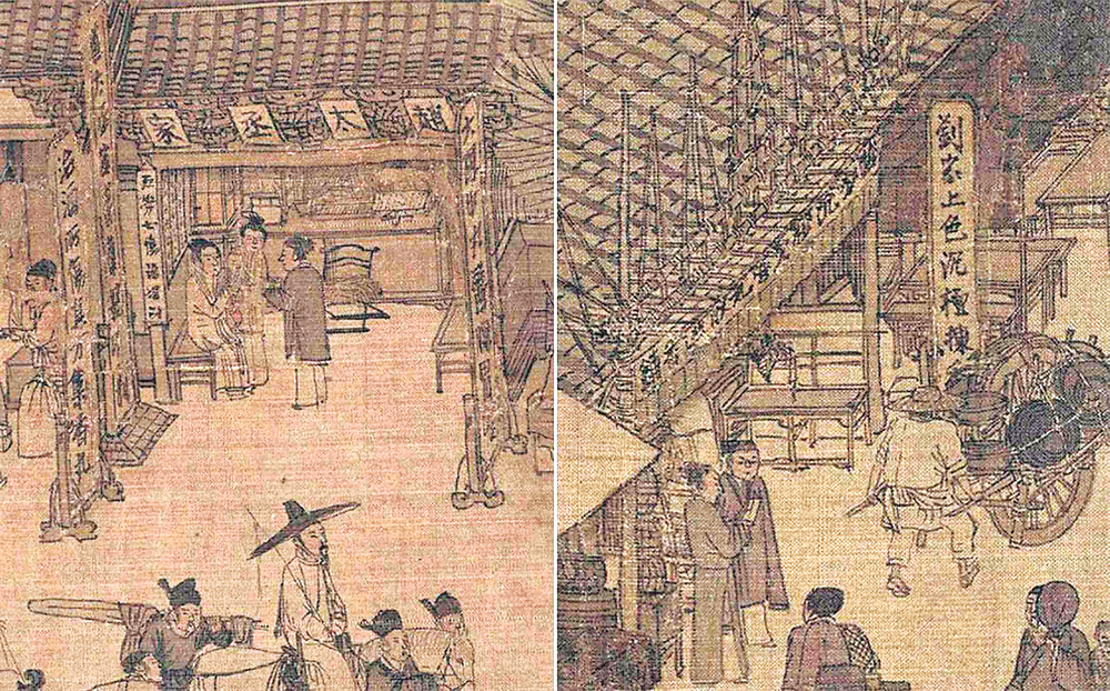 唐宋时期的商标,绝大多数以文字形式来呈现。在北宋画家张择端所绘的《清明上河图》中,有一家卖酒的“孙羊正店”,此店的旁边就是香铺“刘家上色沉檀拣香”,还有医疗机构“赵太丞家”,此外还有很多文字形式的商标。