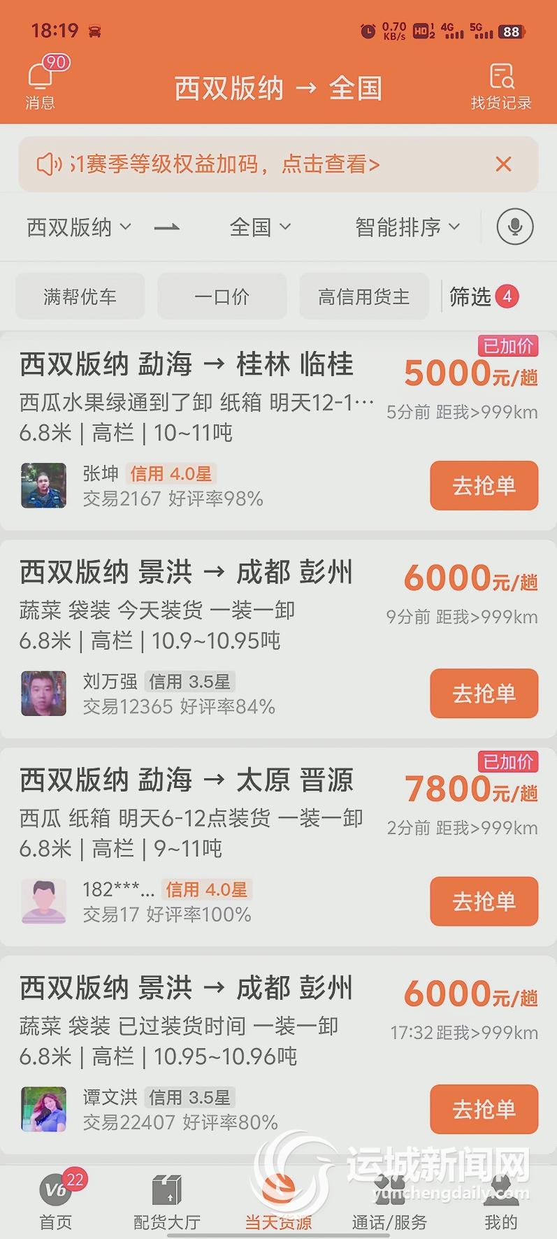 “西双版纳勐海-桂林临桂,西瓜水果绿通到了卸,6.8米、高栏、10吨~11吨,5000元一趟。”